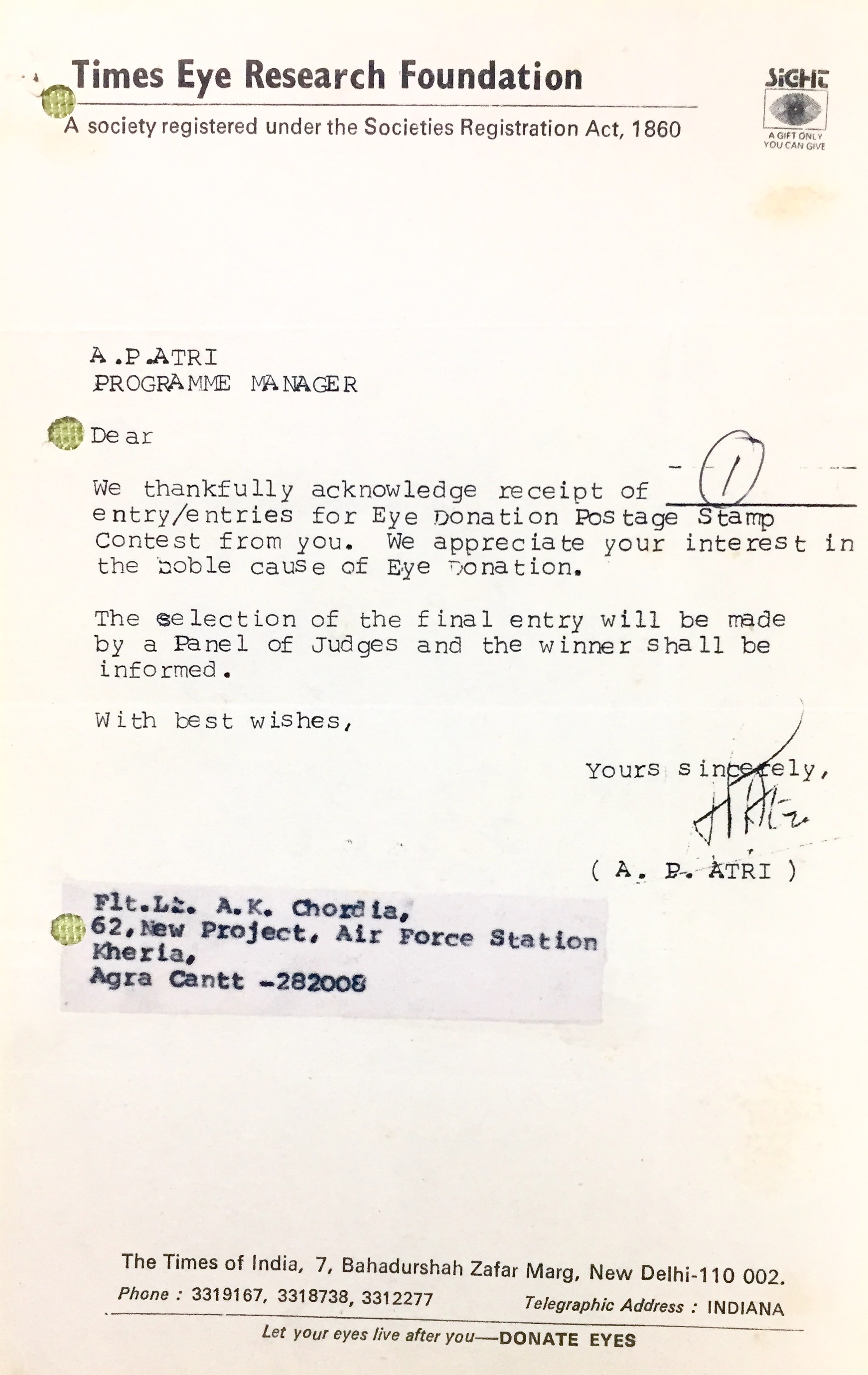 बात अस्सी के दशक की है। टाइम्स आई रिसर्च फाउंडेशन के माध्यम से भारतीय डाक तार विभाग ने नेत्र दान विषय पर डाक टिकिट जारी करने के लिए एक प्रतियोगिता आयोजित की थी। इस तरह के सामाजिक अभियानों में मेरी आस्था ने मुझे इस पहल में शामिल होने के लिए प्रेरित किया। मेरी कल्पना ने एक उड़ान भरी और मैं डाक टिकिट के लिए एक नमूना बनाने जुट गया। जल्दी ही मैंने अपनी प्रविष्टि टाइम्स आई फाउंडेशन को भेज दी।